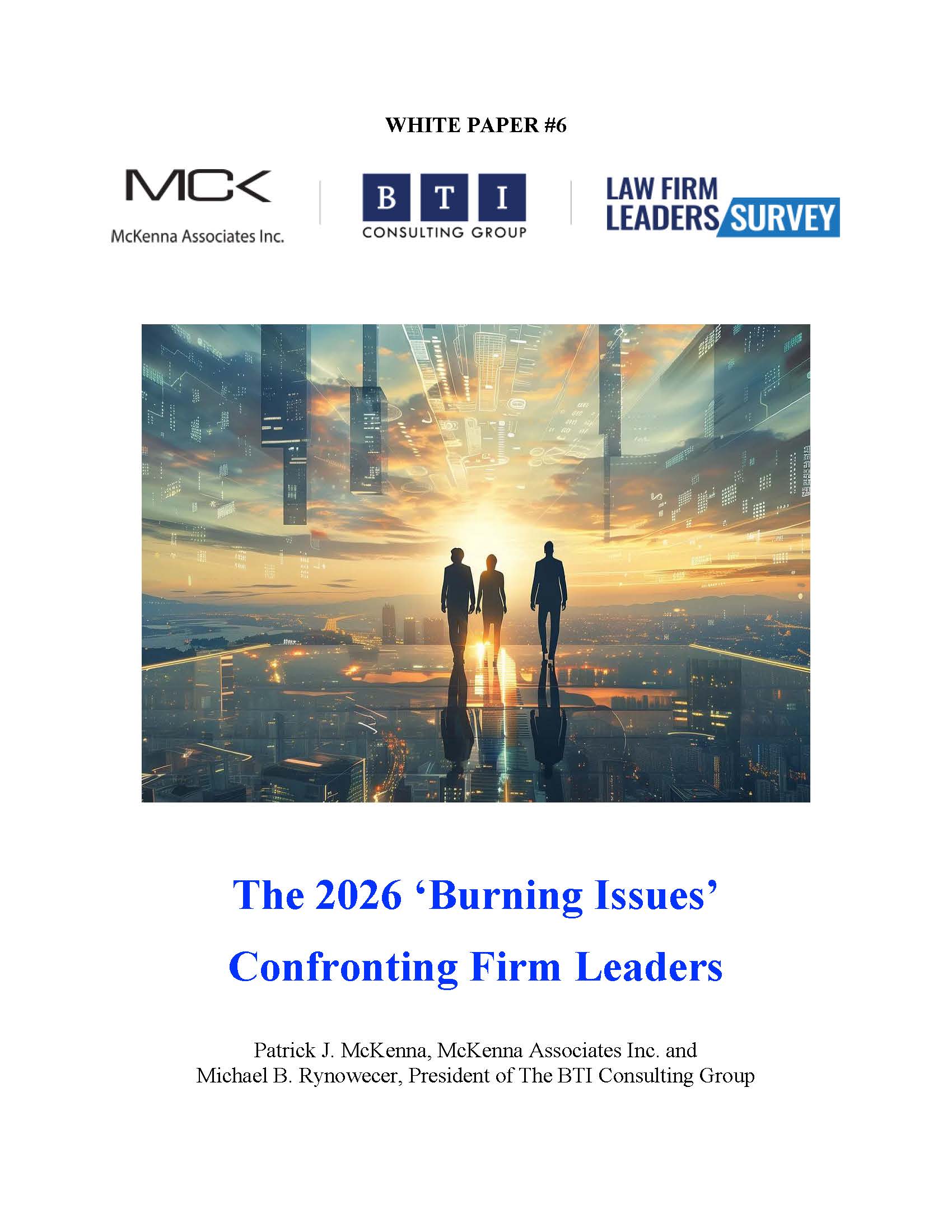 With valuable input from over 200 Law Firm Leaders, internationally recognized consultant Patrick J. McKenna of McKenna Associates Inc. and Michael B. Rynowecer, President of The BTI Consulting Group share the results of our innovative surveys. With up-to-date and useful information on topics ranging from your most important priorities to talent pressures and firm risks your peers are also confronting.